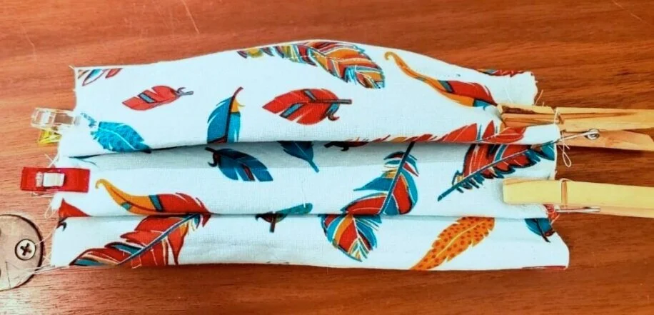 3. The Pipe Cleaner: Place 2 pipe cleaners at the top edge inside of your square. Clamp in place or pin (I know, we are trying not to pin, but you are going to sew here anyway). Sew around the pipe cleaners as close to it as you can. If you’ve got a sewing foot you can move over to one side, do it. You are trying to encase the little guy on three sides so it can’t get away.