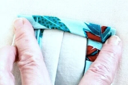 5. Finishing the Ends: Place one of the short rectangles (5” x 2 ½”) over the good side of the mask, right side down. Allow equal selvage (about ½”) to hang over each edge. Sew along edge. Flip rectangle over to back side. Tuck under the ends (ironing helps here). Fold under the raw edge; Tuck finished ties in about 3” evenly apart and sew. Repeat on other side and you are done! You can also finish the ends if you are able to use a zig-zag stitch, by leaving off the end piece and zigzagging the cut ends.