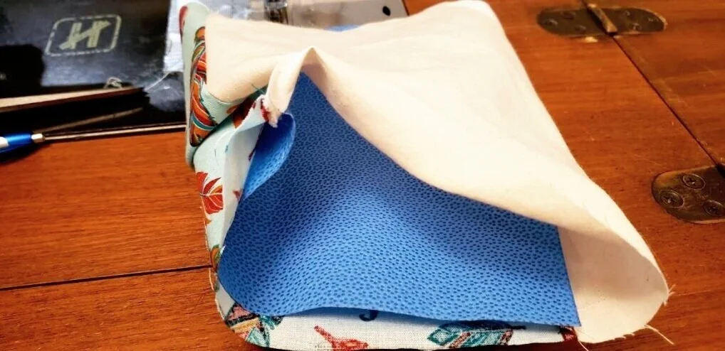 2. The Mask: Place the filter material on the back side of Fabric A (whatever you decide is the front of your mask). Place the right side of Fabric B on top of the right side of Fabric A. Hold or clamp together. You can use clothes pins here. Sew the top and bottom of your square with a straight seam (Be sure to sew through all three layers of front, filter and back) then flip right side out. Smooth hem or iron gently. Don’t put too much heat on the filter material!